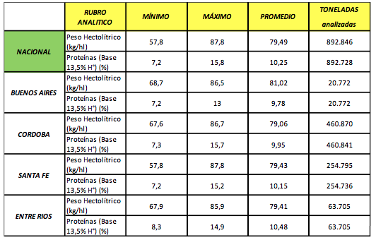 Los altos rendimientos anteriormente mencionados, estuvieron acompañados de buenos pesos hectolítricos (PH) (cerca del 80% de las muestras con PH mayores a 79 kg/hl) y escasos niveles de proteína (más del 70% de lo muestreado presentó valores por debajo de 11% de proteína).