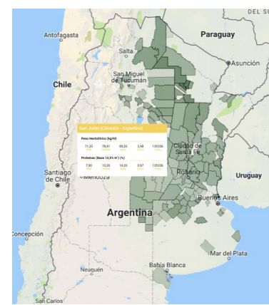 De esta manera se dispone de parámetros orientativos, tales como Proteína y Peso Hectolítrico, desagregado en datos estadísticos provinciales y departamentales, así como también, de un mapa georreferenciado de estos parámetros obtenido por las distintas Cámaras Arbitrales mediante una interconexión de sus bases de datos (Figura 1 y 2).