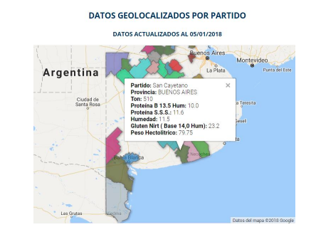 Figura 1: Datos geolocalizados por partido de proteína y peso hectolítrico. Fuente:http://centro.trigoargentino.com.ar/EstadisticaManager/DatosGeo