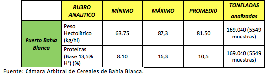 En el cuadro 2 puede observarse la información brindada por la Cámara Arbitral de Cereales de Bahía Blanca de proteína y peso hectolítrico de los productos de la campaña agrícola 2017/2018, que ingresan a las terminales del Puerto de Bahía Blanca, dicha información se actualiza diariamente en el sitio web: http://cacbb.com.ar/trigopan1718.html.