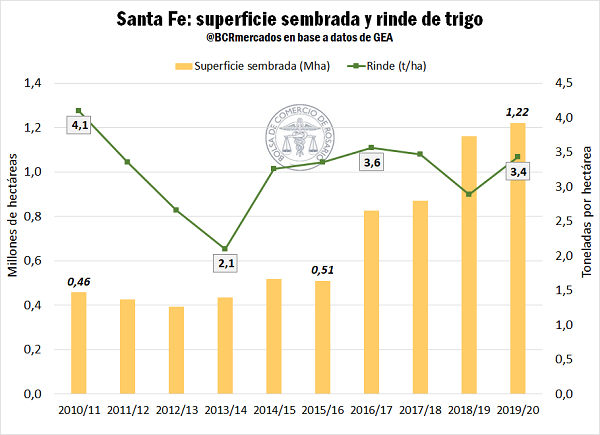 La provincia de Santa Fe, en particular, incorpora 60.000 ha a la producción de trigo en la campaña 2019/20. Con este incremento del 5% en la superficie sembrada, los productores santafesinos apuestan al trigo sobre 1,22 Mha, un récord histórico para la provincia. De esta forma, el cereal consolida su importancia en los planteos productivos de Santa Fe que por segunda campaña consecutiva destina más de 1 Mha al cultivo del cereal.
