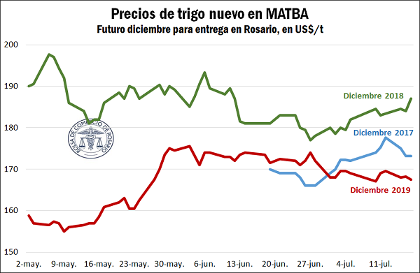 La mejora en las perspectivas de producción presionaron los precios a la baja, los valores negociados por el trigo se movieron a la baja, a contramano de la tendencia del segmento disponible. El día jueves 18, el futuro con entrega cercana en Rosario que vence en diciembre cerró a US$ 214/t en MATBA-ROFEX, un dólar por encima del jueves anterior, en tanto que el contrato representativo de la nueva campaña que vence en diciembre cayó US$ 1,5/t en la semana a US$ 167,5/t.