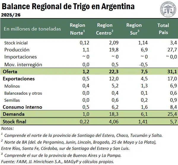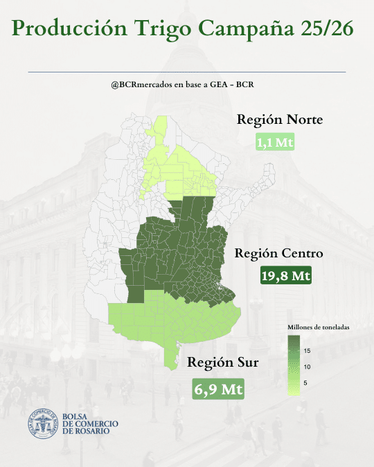 En la Región Norte, la producción subiría a 1,1 millones de toneladas gracias exclusivamente a mejores rendimientos, mientras que la Región Sur —sur bonaerense y La Pampa— mantendría un volumen estable cercano a 6,9 millones de toneladas, compensando menor área con mayores rindes.