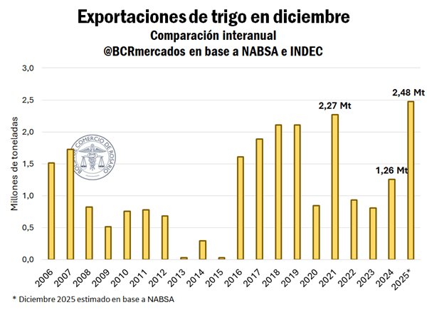 Según datos de la programación de buques del nodo Up River Paraná informados por NABSA, se estiman embarques de trigo por 2,48 millones de toneladas en diciembre, lo que constituye un récord histórico para el mes. El volumen prácticamente duplica los despachos de diciembre de 2024 y supera incluso el máximo previo registrado en diciembre de 2021, cuando se habían exportado 2,3 Mt.
