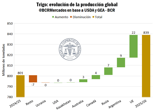 A nivel global, la campaña triguera también fue excepcional. Siete de los ocho principales países exportadores incrementaron su producción. Rusia habría cosechado 88,8 Mt, Australia se encamina a cerrar una campaña de 37 Mt, y la Unión Europea alcanzó los 144 Mt, tras un muy flojo ciclo anterior. Esta abundante oferta global presiona las cotizaciones y limita el potencial de recuperación de los precios.