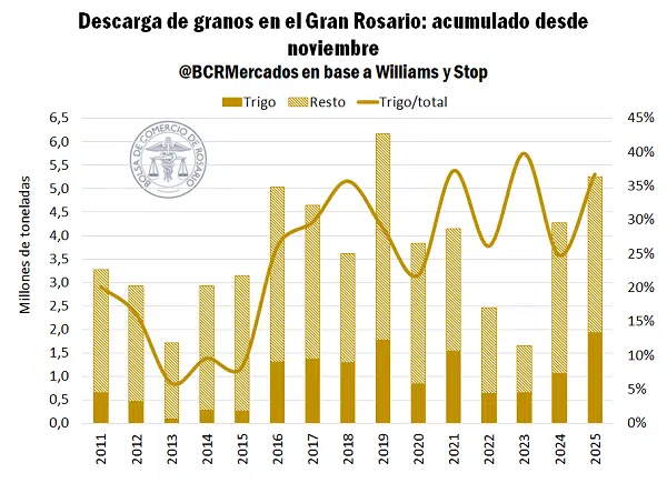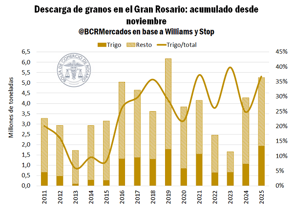 Con un 47% de avance nacional, la cosecha ya impacta de lleno en el sistema logístico. En noviembre, las descargas de trigo en los puertos del Gran Rosario alcanzaron 1,98 millones de toneladas, el doble del promedio del último quinquenio y 80% por encima de la media de la última década. A esto se suma un fuerte ingreso de soja, que aporta otras 2,7 Mt y supera todos los ritmos recientes.