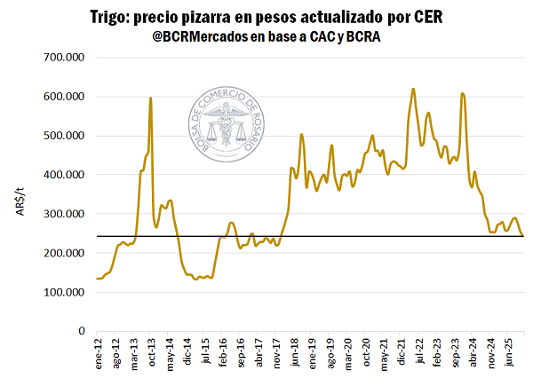 La consecuencia directa es una fuerte presión sobre los precios. El trigo disponible cayó de un promedio de US$ 182/t a mínimos de US$ 161/t, estabilizándose entre US$ 165 y US$ 171/t. En términos reales, la pizarra de Rosario se ubica en su nivel más bajo desde diciembre de 2017.