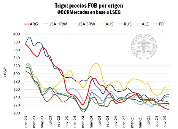 La baja no responde solo al enorme volumen argentino: en el plano internacional, Australia —otro gigante exportador— transita una campaña excepcional, con una cosecha estimada 29% por encima del promedio de la última década según ABARES. Mientras el FOB australiano se mantiene entre los más altos del mundo, el argentino es hoy el más bajo entre los principales exportadores, en valores que no se veían desde enero de 2020.