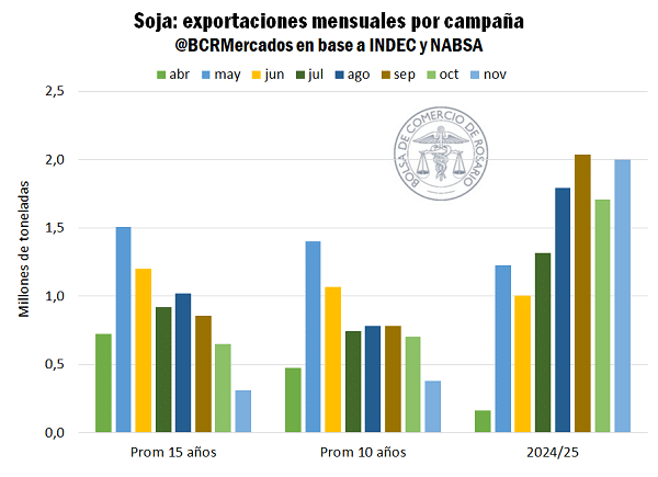 La soja suma más tensión. En noviembre se embarcaron 2 Mt de poroto, récord histórico para el mes, con exportaciones acumuladas de 11,3 Mt, máximos en una década. Al mismo tiempo, aceites y harinas registran ritmos de envíos entre los más altos de la historia, obligando a procesar y movilizar toneladas a contrarreloj.