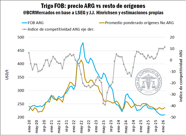 La combinación entre gran oferta y ventana comercial favorable —Argentina cosecha más tarde que los grandes exportadores del hemisferio norte— permitió sostener valores FOB más atractivos desde fines de 2025. La brecha de precios frente a otros orígenes alcanzó su mayor nivel en seis años, consolidando la competitividad del cereal nacional.