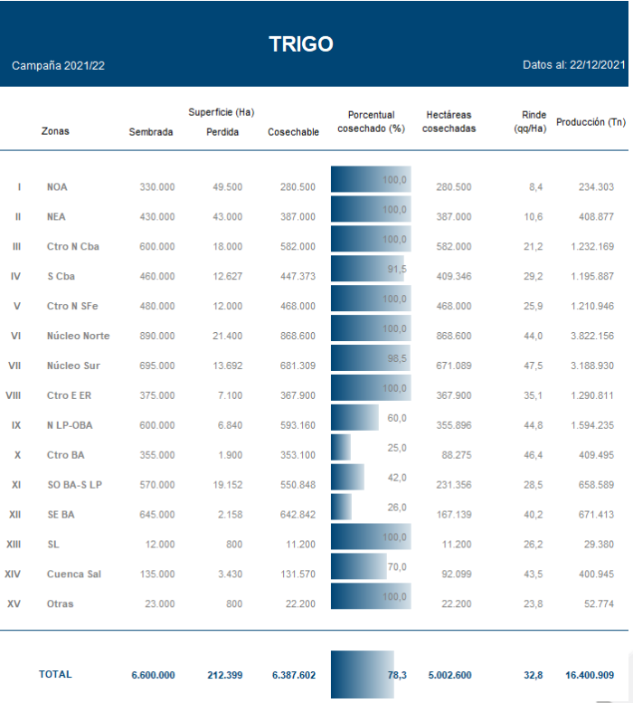 En paralelo, sobre el Norte de La Pampa – Oeste de Buenos Aires, luego de un avance intersemanal de casi 40 puntos, se reporta rinde promedio récord de 44,8 qq/Ha, mientras que hacia el Centro de Buenos Aires, la región también reporta un resultado promedio récord de 46,4 qq/Ha, aunque el avance de cosecha cubre solo un 25 % de su área apta.
