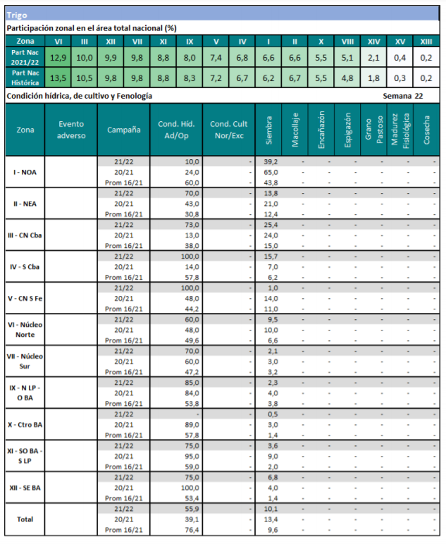 Al presente informe se estima que la siembra de trigo cubrió el 10,1 % del área nacional proyectada en 6,5 MHa para este nuevo ciclo, siendo el NOA la región que mayores progresos de siembra ha alcanzado con un 39,2% de su superficie proyectada ya incorporada. En comparación con la campaña previa, la siembra registra una demora de 3,3 puntos porcentuales. Sin embargo, se encuentra alineada al promedio de las últimas cinco campañas, con un adelanto de solo 0,5 puntos porcentuales. Del total del área actualmente implantada, un 55,9% muestra una condición hídrica Adecuada/Óptima. Las últimas lluvias registradas en el centro-este y sur del área agrícola apuntalan la intención de siembra, aunque también ralentizan el ritmo de avance de la siembra en algunas zonas con falta de piso