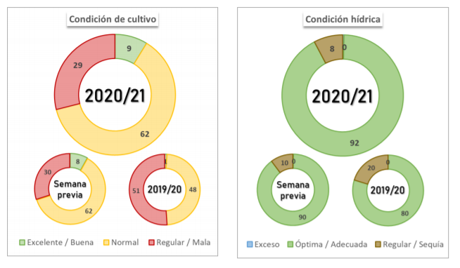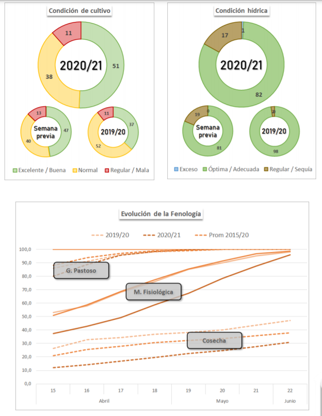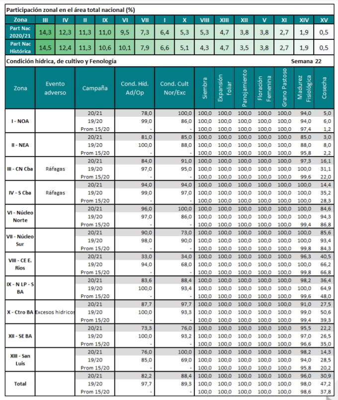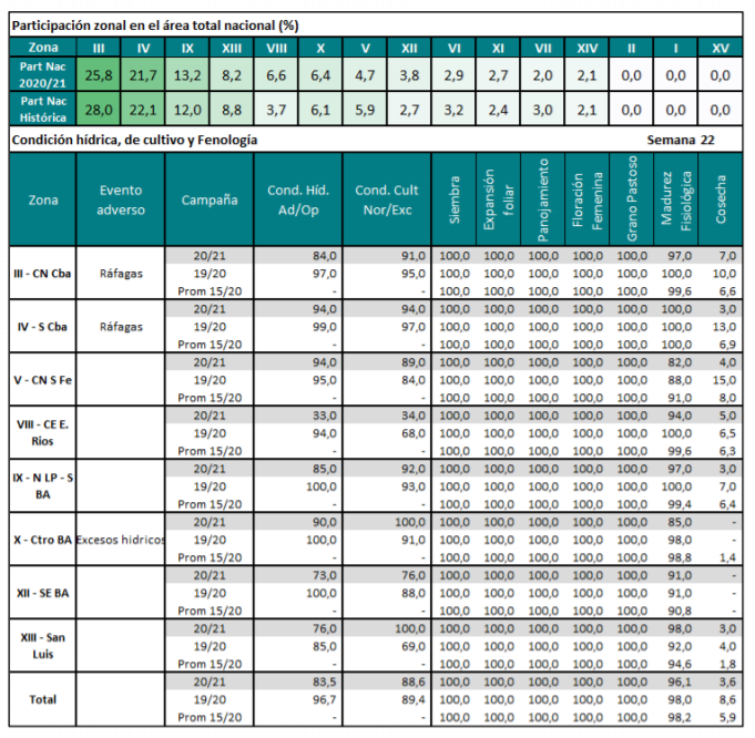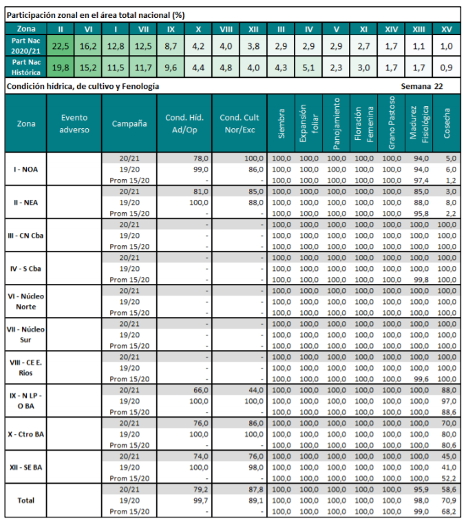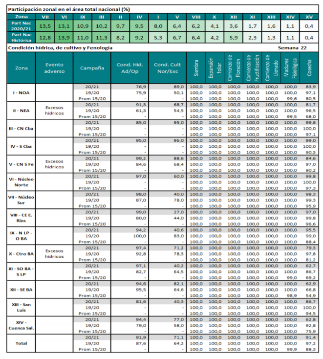 La cosecha de soja total cubrió el 91,4 % de la superficie estimada a nivel nacional, registrando un atraso interanual de 5,8 puntos porcentuales; y la finalización de las labores de recolección de soja de primera en las zonas Centro-Norte de Córdoba, Sur de Córdoba, Núcleos Norte y Sur y Centro-Este de Entre Ríos. Mientras los cuadros de primera ocupación reportan variabilidad en los resultados a campo, planteos de segunda informan rindes más homogéneos. Se estima que un 71 % de la superficie con cultivo en pie mantiene una condición Normal/Buena/Excelente, registrando excesos hídricos en las zonas Centro de Buenos Aires y Centro-Norte de Santa Fe, que retrasan el avance de la cosecha y agravan la situación en los bajos