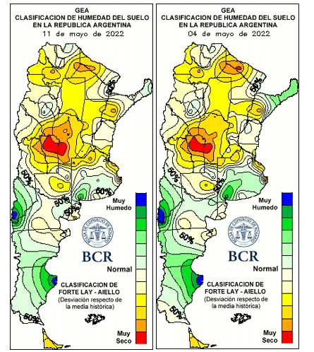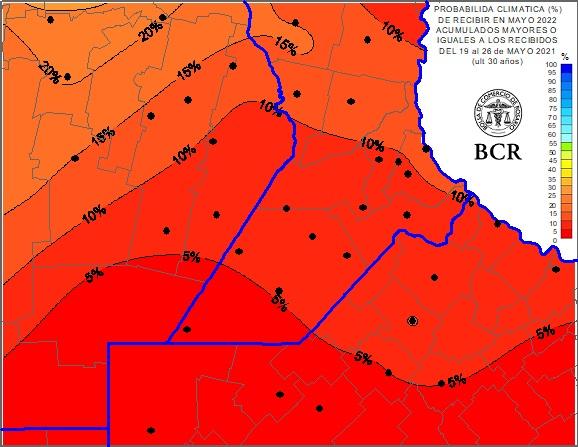 Tan solo un 10%. La primera década de mayo 2022 termina con ausencia total de precipitaciones sobre la región pampeana. En la mitad oriental, la humedad en los perfiles es adecuada, pero a medida que nos desplazamos hacia el oeste, el gradiente negativo copia el patrón que marcaron las lluvias de abril. Ante este escenario, las miradas están puestas en repetir el evento de lluvias que dejó en algunas localidades hasta más de 100 mm entre el 16 al 29 de mayo del 2021. Las lluvias de otoño fueron el puntapié para la siembra del trigo y una de las principales causas del éxito del trigo 21/22. Este año, las probabilidades de repetir ese evento en lo que queda de mayo promedian tan solo un 10% en la región y hacia el noroeste llegan hasta apenas un 20%. Ante la cercanía de la siembra del cereal, la falta de agua es un tema de preocupación primordial para implantar las 1,53 M de ha que se intencionan, un 10% menos que en el 2021.