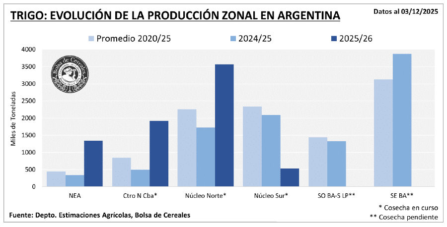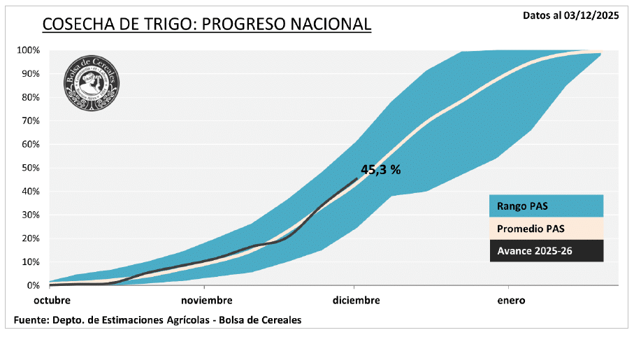 El avance de la cosecha de trigo 2025/26 mantiene un ritmo firme y sostenido. De acuerdo con el último informe, la trilla ya cubre el 45,3% del área apta, luego de un progreso intersemanal de 11,4 puntos porcentuales. Las labores se despliegan con normalidad en el centro del área agrícola, donde los rendimientos continúan mostrando valores destacados.