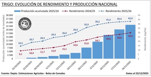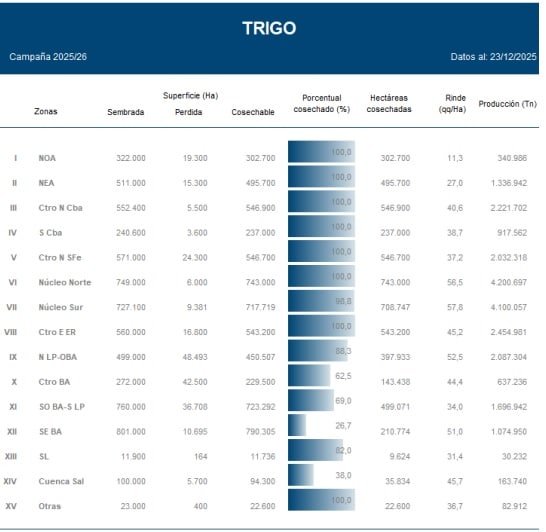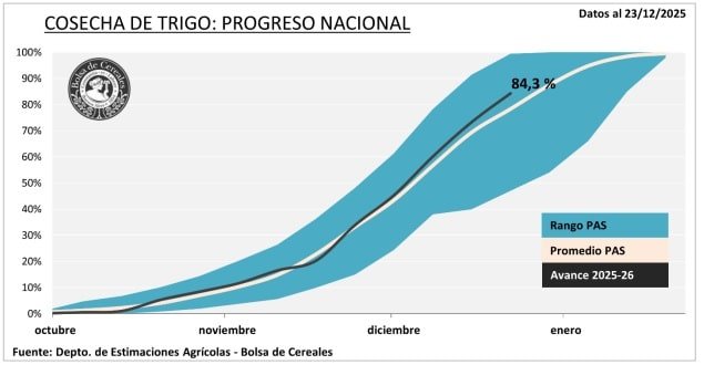 Con un avance de cosecha que supera el promedio histórico y rindes destacados en varias regiones, el trigo sostiene una proyección nacional de 27,1 millones de toneladas.
