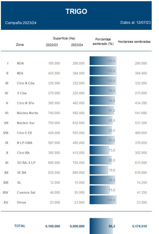 Tras un progreso intersemanal de siembra de 4,8 p.p., se ha cubierto el 86,2 % de las 6 Ha proyectadas para la campaña 2023/24. Excesos hídricos sobre el sur del área agrícola demoran el avance de las labores.