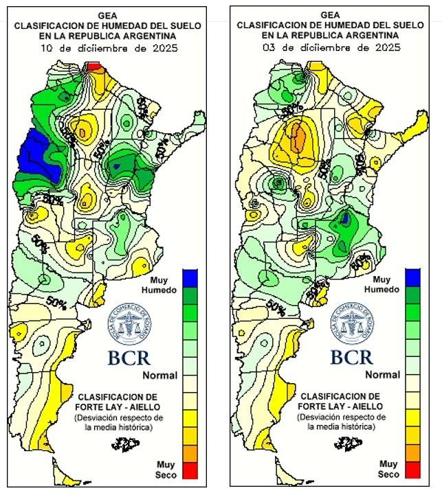 El 90% del maíz temprano se encuentra entre muy bueno y excelente, con la mitad de los lotes en plena floración y el resto en panojamiento. Sin embargo, los técnicos advierten que una lluvia importante será clave para sostener el potencial en los primeros lotes que ingresaron al período crítico.