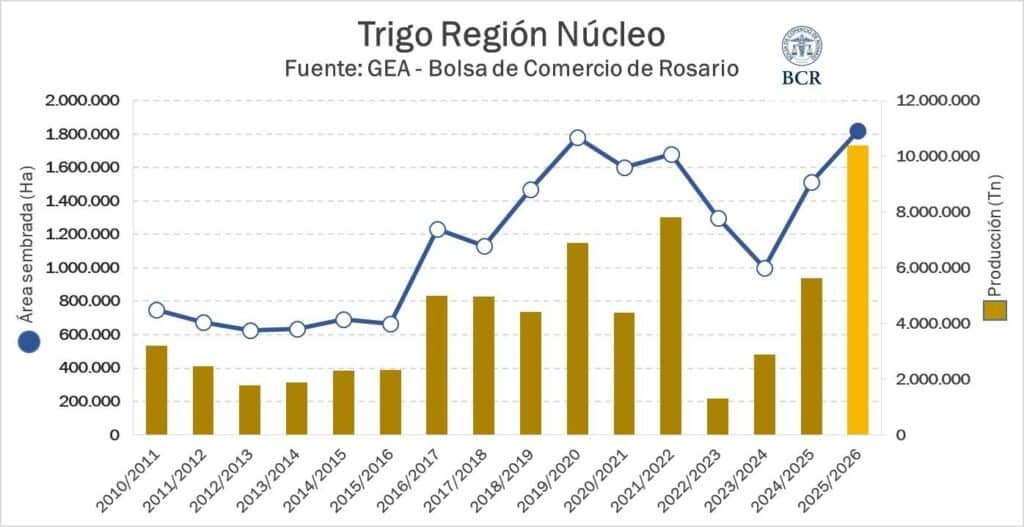 La campaña triguera 2025/26 de la región núcleo quedará registrada como una de las más extraordinarias jamás vistas. Con rindes promedio de 60 qq/ha y un fuerte incremento del área sembrada detectado mediante análisis satelital, la producción estimada asciende a 10,4 millones de toneladas, un 33% más que el récord previo de la campaña 2021/22 (7,8 Mt).