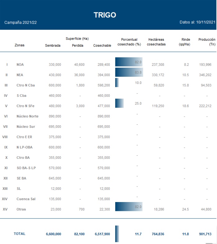 Finalmente, al sur de la región agrícola se relevaron abandono de lotes afectados por un prolongado déficit hídrico en sectores del Sudoeste de Buenos Aires y Sur de La Pampa. En términos generales, los rindes previstos para el sur bonaerense oscilan entre 28 y 47 qq/Ha, pese a ello, las altas temperaturas junto con la demora en la reposición de humedad ponen en riesgo los resultados a cosecha