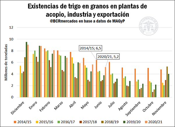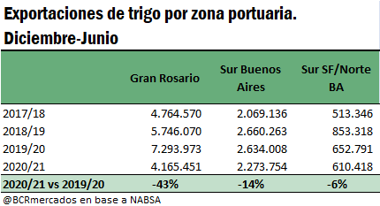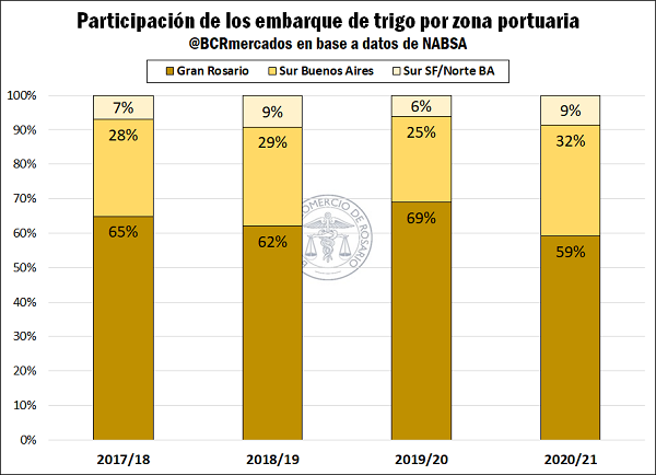 En el actual ciclo comercial, los despachos de trigo desde el Gran Rosario han perdido participación notoriamente respecto a los embarques desde los puertos del sur de Santa Fe, y centro sur de Provincia de Buenos Aires. En lo que va de la campaña 2020/21, los despachos desde el Gran Rosario representaron tan solo el 59% del volumen total de trigo que Argentina lleva exportador. Esto se ubicó 10 puntos porcentuales por debajo de la participación que ostentaba en la campaña 2019/20, cuando alcanzó el 69% de los despachos.