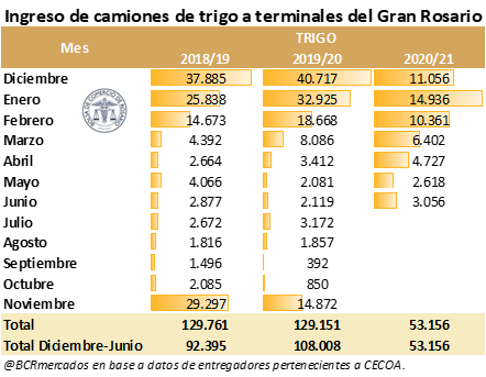 Podemos analizar el mismo fenómeno a partir del ingreso de mercadería al Gran Rosario. En lo que va de la campaña comercial ingresaron al área para descargar 53.156 camiones de trigo sumando los datos diarios provistos por las empresas entregadoras de arribos a las terminales de la zona hasta las 7 a.m., aproximadamente la mitad de los ingresos contabilizados en la campaña 2019/20.