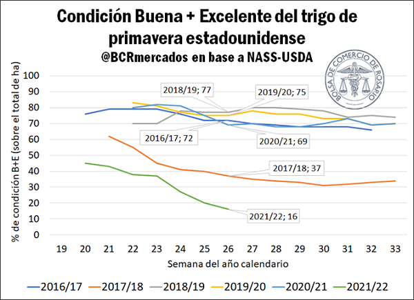 A la semana 26 del año, apenas el 16% de los lotes de trigo de primavera se encuentran en condición Buena + Excelente. Este dato se encuentra lejos del promedio de los últimos 5 años, en torno al 66%, y aún más lejos promedio de los últimos 30 años, que para esta semana se ubica en el 69% de los lotes.