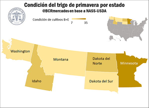 La zona norte de las Planicies estadounidenses, que concentra el grueso de la producción de trigo de primavera, es la que se encuentra en peores condiciones. Montana y Dakota del Sur apenas disponen del 7% de sus lotes con condiciones B+E. No conforme con ello, Idaho y Dakota del Norte, que concentran el 73% de las hectáreas sembradas, se encuentran en un 18%.