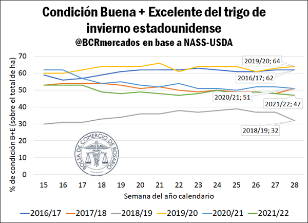 A pesar de la crítica condición del trigo de primavera, debe destacarse que el mismo representó el 29% de la cosecha 2020/21 de trigo estadounidense y que, incluso, la proporción puede ser menor si se toma el promedio de las últimas cinco campañas, lo cual ronda el 26%.