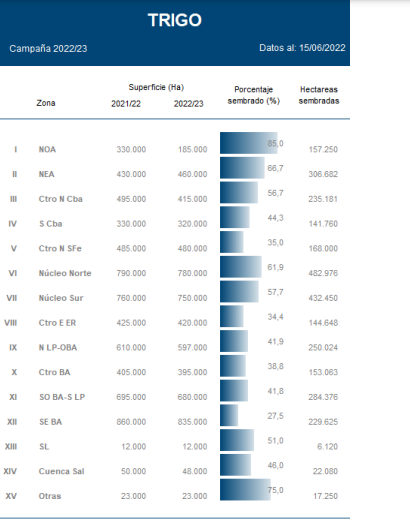 Tras relevar un progreso intersemanal de 17,1 puntos porcentuales, el 47,4 % del área proyectada se encuentra implantada, lo que en términos absolutos representa algo más de 3 MHa. Las interrupciones de las labores debidas a la falta de humedad superficial continúan afectando fundamentalmente al centro y norte del área agrícola, traduciéndose en una demora interanual de 10 pp a nivel nacional. En simultáneo, la ausencia de lluvias en el pronóstico a corto y mediano plazo, continúan poniendo en riesgo la implantación de buena parte de las hectáreas que restan por sembrar lo cual podría afectar nuevamente nuestra proyección de área.