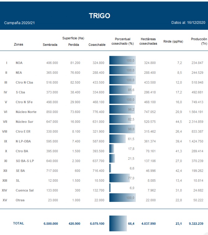 Se ha recolectado el 66,4 % del área apta, con un progreso intersemanal de 12,9 puntos porcentuales. Se registra una demora de -11,1 pp. El rinde medio se ubica en 23,1 qq/ha y se mantiene la proyección de 16,8 MTn.