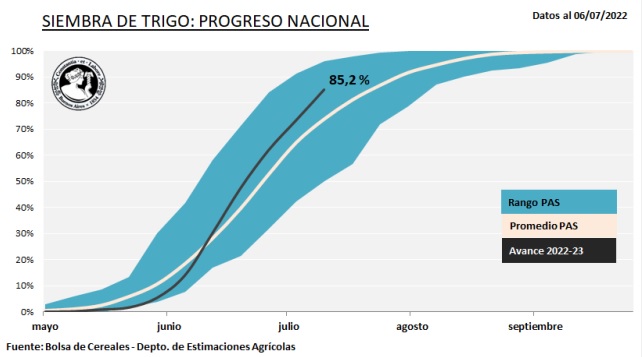 La proyección de siembra cae 100 mHa por déficit hídrico y se ubica en 6,2 MHa. El avance de siembra ya cubre el 85,2 %, y se mantiene una demora interanual de -6,1 puntos porcentuales.