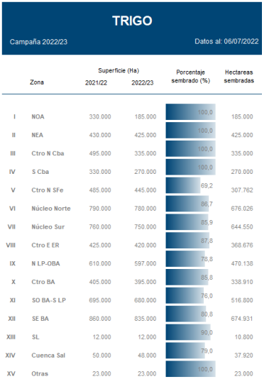 La superficie proyectada para la campaña 2022/23 cae 100.000 hectáreas desde nuestro informe previo y se ubica en 6,2 MHa (reducción interanual: -7,5%). Este ajuste se debe a la imposibilidad de cumplir con los planes de siembra en zonas del centro y norte del área agrícola donde la ventana de siembra se encuentra próxima a cerrar. De esta nueva proyección, ya se encuentran implantadas cerca de 5,3 MHa, lo que representa el 85,2 % del total nacional, reflejando una demora interanual de -6,1 puntos porcentuales. Al momento de la presente publicación, las labores se concentran en lotes del centro-este y sur del área agrícola que aún disponen de humedad para sembrar.