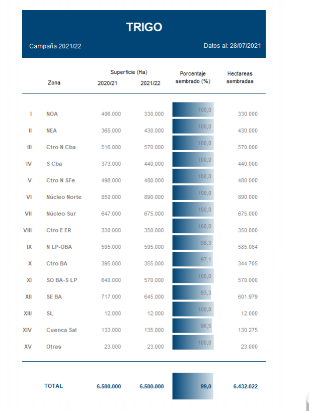 De las 6,5 MHa estimadas para la campaña 2021/22, ya se incorporaron el 99 %. El progreso intersemanal de siembra fue de 1,1 puntos porcentuales, y se mantiene un adelanto interanual de 3,1 pp