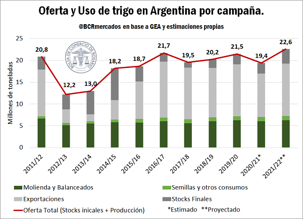 A estas entre 5,7 y 6,2 Mt que se destinan a molienda se le suman unas 50.000-100.000 t que se utilizan para la producción de balanceados, en tanto que el trigo utilizado para semilla y otros consumos se mantiene entre 800 y 900 mil toneladas. De mantenerse esta tendencia, se podría suponer un consumo interno del cereal de invierno de unas 7,2 Mt.
