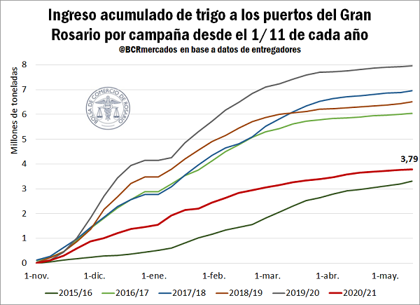 Habiendo transcurrido ya la mitad de la actual campaña comercial, esta proyección de menores despachos desde las terminales del Up River pareciera confirmarse. De hecho, cuando uno observa el ingreso acumulado de trigo en camiones a los puertos de la región, se obtiene que el volumen de trigo ingresado asciende a 3,8 Mt, un 52% menos de las 8 Mt que habían ingresado a esta altura del año anterior y el menor volumen desde el ciclo 2015/16.