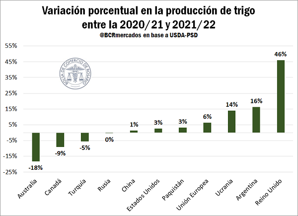 En el plano internacional, las novedades de la semana se desprenden de los nuevos números informados por el Departamento de Agricultura de Estados Unidos (USDA) en su reporte de Oferta y Demanda Global. En dicho informe, el organismo publicó sus primeras estimaciones para el ciclo 2021/22 y proyecta una producción récord a nivel global en 789 Mt. Considerando los principales 15 países productores del cereal, aquellos que más verían incrementada su producción de un año a otro serían, en primer lugar, el Reino Unido (crecería un 46% en esta campaña, pasando de 9,6 a 14,1 Mt), seguido por Argentina (un incremento del 16% respecto del ciclo previo) y Ucrania (un aumento productivo del 14%).