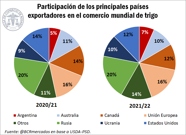 Por último, por el lado del comercio, por primera vez en la historia se comerciarían más de 200 Mt (202 para ser más precisos). Según el organismo, las exportaciones argentinas ascenderían a 13,5 Mt, aunque aquí resulta necesario realizar la salvedad de que el USDA considera no sólo el trigo en grano sino también el equivalente en grano de las exportaciones de harina. De esta manera, Argentina representaría un 7% del total de las exportaciones mundiales y mantendría su posición como el 7mo principal exportador, aunque con una mayor participación sobre el total (en la 2020/21 la cuota de participación de nuestro país se estima en el 5%).