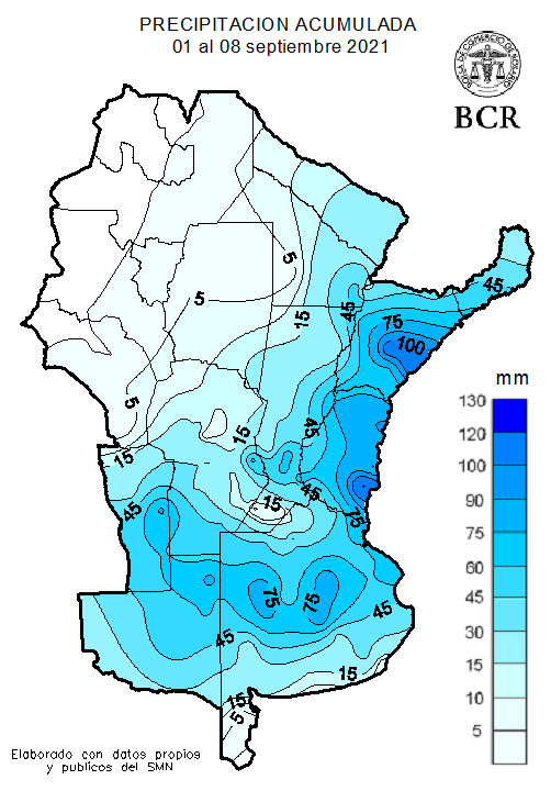 Las tormentas que comenzaron el 1ro de setiembre y se han prolongado hasta hoy (8/11), terminó con tres meses de falta de agua en la región pampeana. Numerosas localidades del centro bonaerense han superado los 90 mm acumulados durante estos días. El 60% de Buenos Aires recibió entre 45 y 70 mm, lo mismo el 57% de La Pampa y el 90% de Entre Ríos. En Santa Fe, ese monto solo lo recibió el centro sur y una franja del este. La provincia en promedio alcanzó 30 mm. En Córdoba, lo más favorecido fue el sur de la provincia y norte del departamento Marcos Juárez con 45 a 60 mm. Las tormentas dejaron en el 63% del territorio cordobés lluvias mayores a 15 mm. La zona productora de San Luis también cambia abruptamente de escenario con más de 45 mm. Hubo lluvias muy importantes en Misiones y Corrientes, algunas zonas superaron los 100 mm. El noroeste Argentino quedó fuera de alcance. Las zonas productivas del este de Chaco y oeste de Santiago del Estero apenas recibieron un puñado de milímetros. Para el trigo 2021/22 estas lluvias marcaron un hito porque dejan atrás un escenario muy diferente. Hasta hace un mes, se proyectaban 20,1 Mt por la falta de agua. Y a fines de agosto el panorama se agravaba con 650.000 ha regulares a malas. Pero con estos 8 días de lluvias, la proyección cambia de dirección y se estima un horizonte productivo de 20,5 Mt de trigo. Este guarismo surge de tener en cuenta 6,9 M ha sembradas y 200 mil ha que no llegarían a ser cosechadas.