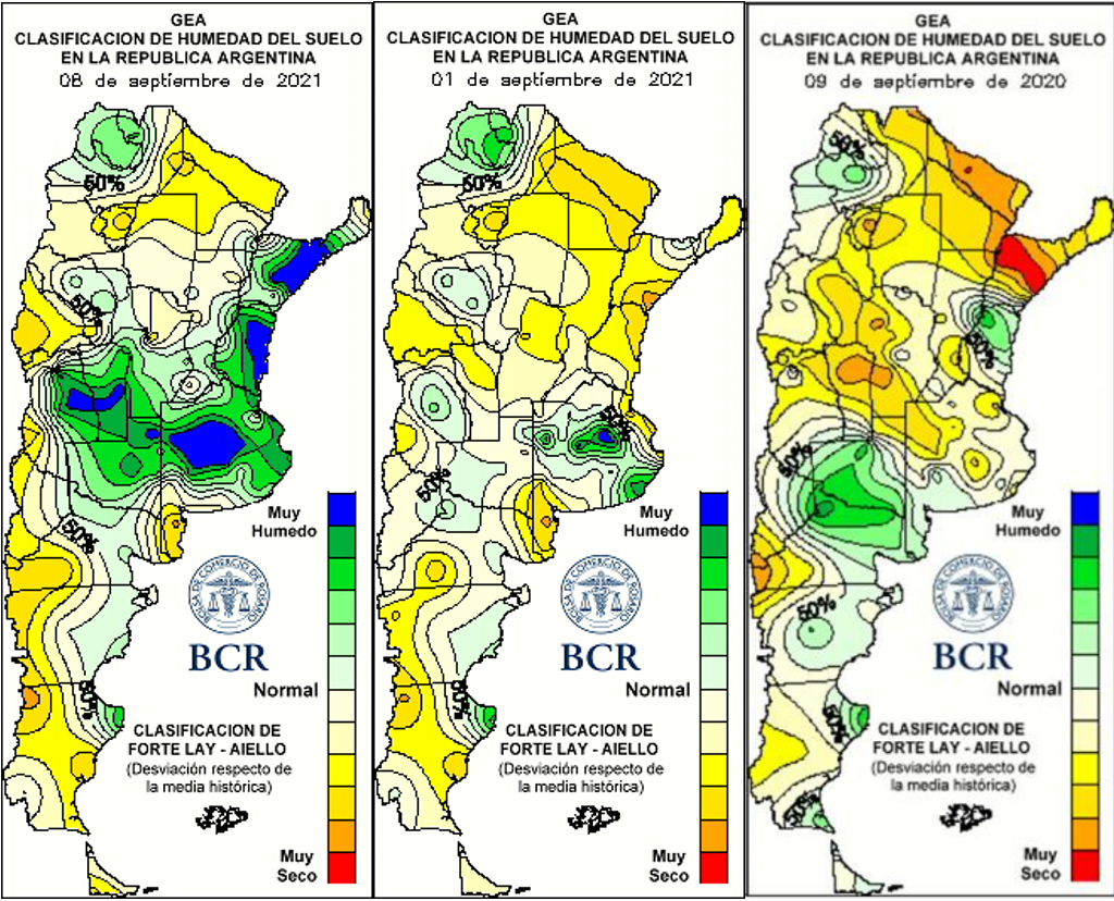 Las recientes lluvias son el mejor inicio de esta campaña inédita del maíz que sigue sumando hectareaje. A nivel nacional, hace un mes atrás se esperaba un 6% más de área respecto al año pasado. Se señalaba que esta tendencia podía seguir creciendo y ahora llega el ajuste con 100.000 ha más. Comparando con el año pasado, la intención de siembra ya es de 7,3% más. ¿La tendencia a sumar más maíz puede fortalecerse? Pueden seguir los ajustes, el comportamiento de las lluvias tiene buena parte de la respuesta. Por eso es tan importante lo que ha pasado en esta primera semana de setiembre: tras las lluvias se han fortalecido las decisiones y se piensa en sumar más lotes tempranos que el año pasado. De todas maneras, después de los excelentes resultados de las siembras tardías, estas son una opción muy importante para un año en el que el escenario Niña sigue fortaleciéndose. Al respecto Aiello señala en esta semana que “ya es casi seguro que transitaremos el semestre cálido bajo la influencia de otra Niña, probablemente de menor intensidad. Puede que sus efectos negativos no sean demasiado intensos, pero no habrá aportes adicionales de humedad desde el oeste. Esto limitará el desarrollo pluvial de la campaña gruesa al desempeño de las circulaciones de escala regional y a los aportes de humedad que pueda proveer el Atlántico”. Con 7,9 M ha que se sembrarían, 6,9 M de ha de cosecha para el circuito comercial, se espera una producción que rondaría los 55 a 56 M Tn, cifra inédita para Argentina.