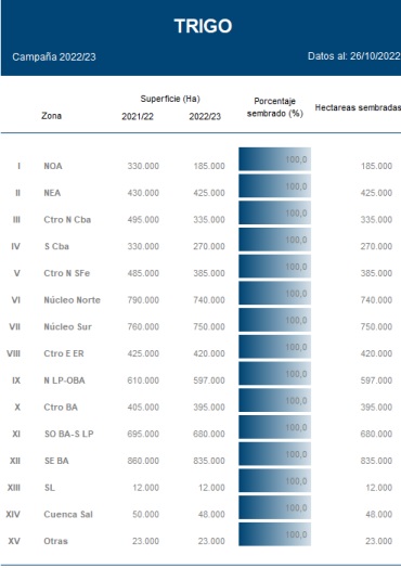 Finalmente, sobre el norte, las labores de cosecha avanzan sobre el NOA con rendimientos medios de entre 6 y 8 qq/Ha, y reportes de área perdida o destinados a cobertura. Sobre el NEA, los rendimientos esperados se mantienen cercanos a los registrados durante la campaña 2021/22 y no superarían los 12 qq/Ha en promedio.