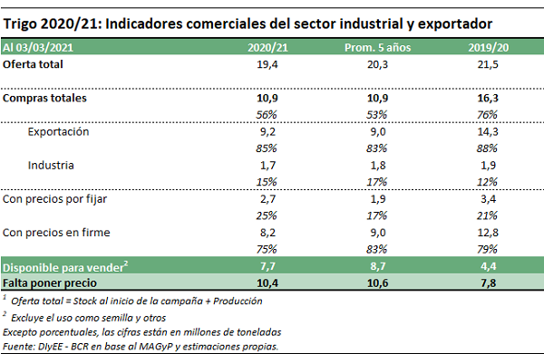 De todas maneras, el aspecto más distintivo de la comercialización de trigo 2020/21 es la proporción de negocios pactados sobre los cuales aún no se ha fijado precio. Del total de las compras realizadas hasta la fecha, un 25% aún no tiene precio firme, una proporción considerablemente superior a la observada tanto en 2019/20 como en el promedio de las campañas anteriores.