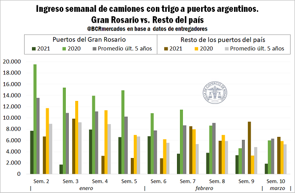 Asimismo, el menor volumen embarcado a la fecha guarda correlación con el también menor ingreso de camiones con trigo a los puertos del país. Para el análisis de esta segunda variable se deja fuera los arribos camioneros a puerto de diciembre, ya que durante más de la mitad del primer mes de campaña las medidas de fuerza gremiales impidieron completamente la descarga de granos en terminales. El gráfico a continuación, que exhibe los ingresos de camiones con trigo a puertos argentinos a partir de la primera semana completa de enero, pone en evidencia que el arribo semanal del cereal a las terminales del Gran Rosario fue siempre menor tanto al volumen ingresado el año previo como al promedio de los últimos cinco años. Así, durante el pico de cosecha, el trigo 2020/21 estuvo siempre muy lejos de igualar la media de ingresos semanales de las últimas 5 campañas.