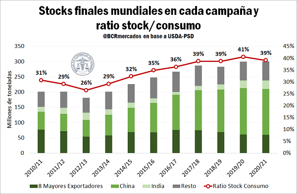 Por último, dado que el aumento en las estimaciones de consumo supera al aumento en las proyecciones de producción, los stocks finales globales sufrieron un ajuste de 3 Mt en relación a la estimación previa. De todas maneras, aún a pesar del recorte, el stock sería el más elevado en términos absolutos, aunque sí se observaría una reducción en el ratio stock/consumo.