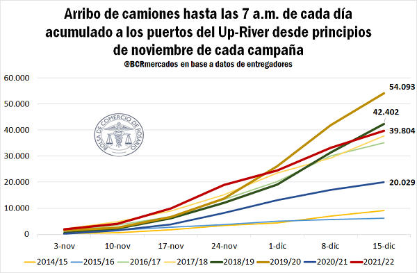 Tomando las unidades arribadas hasta las 7 a.m. de cada día, el acumulado del 3 de noviembre al 16 de diciembre asciende a 39.804 camiones, por debajo de las campañas 2018/19 y 2019/20 en igual período. Lógicamente, los registros actuales del ingreso de trigo 2021/22 superan ampliamente el volumen recibido del cereal hace un año, cuando la magra producción de la región centro y norte del país, sumado a los conflictos gremiales que paralizaron los puertos de la región por prácticamente todo el mes de diciembre dejaron como saldo una fuerte caída en el ingreso de camiones (20.029 unidades, prácticamente la mitad de lo que ingresó este año).