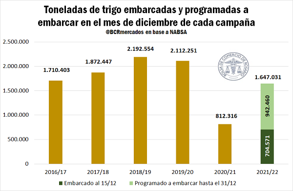 Entre lo ya embarcado y lo programado a embarcar, se despacharán 1,65 Mt del cereal en el mes que corre, el doble de lo embarcado en diciembre 2020. Sin embargo, sería el segundo volumen más bajo en 6 años.