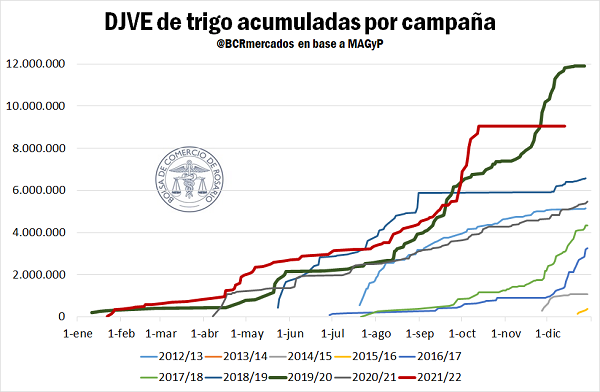 En lo que respecta a las ventas externas del cereal, las novedades son, paradójicamente, la falta de novedades. Después de una fuerte aceleración en el anote de declaraciones juradas por ventas al exterior (DJVE) entre septiembre y octubre, que llevaron a la 2021/22 a marcar un récord para el momento del año con 9,1 Mt declaradas, noviembre culminó sin nuevas ventas externas y en lo que va de diciembre sólo se anotaron 1.618 t. Por ello, el volumen de ventas de la campaña actual fue superado por la 2019/20.