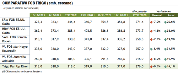 Esta situación en la logística terrestre se replica asimismo en el transporte marítimo del cereal. Teniendo en cuenta los buques de trigo despachados entre el 1° y el 15 de diciembre y lo programado a embarcar entre el 15 y el 31 del mes, se despacharán al exterior 1,65 Mt del cereal, más que duplicando el volumen despachado en todo el mes de diciembre del 2020. A pesar de este gran crecimiento interanual, el volumen que se despacharía en el corriente mes sería inferior al que se embarcó en diciembre de las anteriores cuatro campañas (2016/17 a 2019/20)
