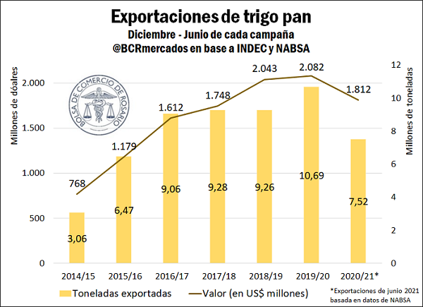 A pesar de ello, la mejora de los precios internacionales del trigo brindó un gran sostén al valor de las exportaciones en los últimos meses. De esta forma, el valor exportado de trigo pan 2020/21 hasta junio se ubica en US$ 1.812 millones, lo que refleja una caída del 13 % interanual, siendo un guarismo mucho menor al registrado en cantidades enviadas al exterior. En estos meses de la campaña 2020/21 el promedio de precios FOB del trigo pan se ubicó en US$ 273,22/t, un 13,3 % por encima de los US$ 241/t alcanzados para el mismo período del año pasado.