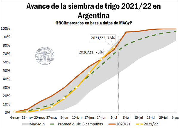 Por otra parte, es importante destacar el aceleramiento en las labores de siembra del trigo 2021/22. Luego de superar, a mediados de junio, el promedio de los últimos años respecto al porcentaje relativo del área estimada a sembrar, el avance de siembra de la campaña 2021/22 de la semana pasada se puso a la altura del año comercial anterior. Mientras que el último dato registrado al 1° de julio muestra un avance de siembra que ya supera el 78 % del área objetivo de casi 7 M ha, es mayor al nivel de siembra del año anterior, que además proyectaba un área objetivo de menor extensión, en torno a las 6,73 M ha según el Ministerio de Agricultura, Ganadería y Pesca (MAGyP).